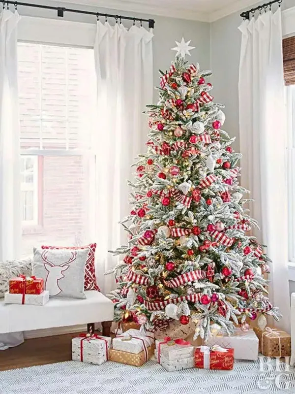 5. Đính ngôi sao/topper và hoàn thiện: Phía trên cùng ở đỉnh cao của cây thông bạn hãy gắn ngôi sao trang trí, thiên thần hoặc nơ lớn. Đảm bảo nó được gắn chắc chắn và cân đối. Cuối cùng, trải vải giả tuyết hoặc đặt những món quà nhỏ xung quanh gốc cây để hoàn thiện khung cảnh.