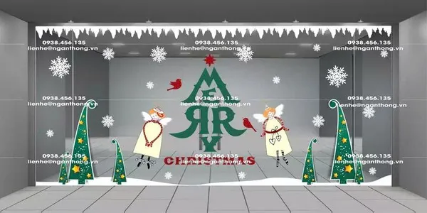 - Cửa kính mặt tiền & cửa sổ: Đây là “bộ mặt” thu hút mọi ánh nhìn. Những hình ảnh như tuyết rơi, cây thông phủ tuyết, hoặc dòng chữ “Merry Christmas” bằng decal trong suốt dán lên cửa kính sẽ tạo hiệu ứng vô cùng lung linh dưới ánh đèn, từ bên trong lẫn bên ngoài.