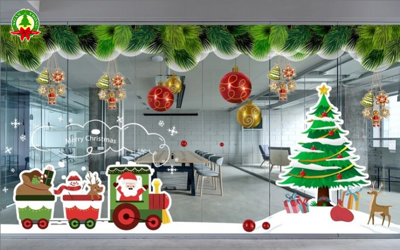 - Decal cây thông Noel kết hợp hộp quà, tạo điểm nhấn trung tâm